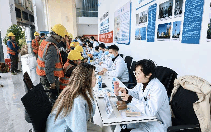 义诊现场设置了健康筛查区、中医体验区和健康科普区,多科室的专家团队为项目部全体职工提供了一站式健康服务。