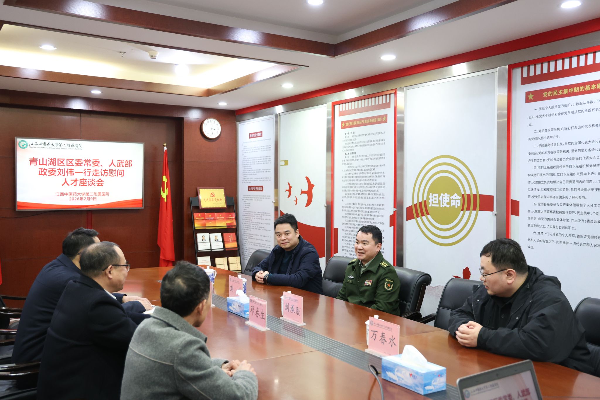 新春佳节来临之际,青山湖区区委常委、人武部政委刘伟一行专程到我院走访慰问高层次人才代表。医院党委书记邓春生、副院长李林热情接待。